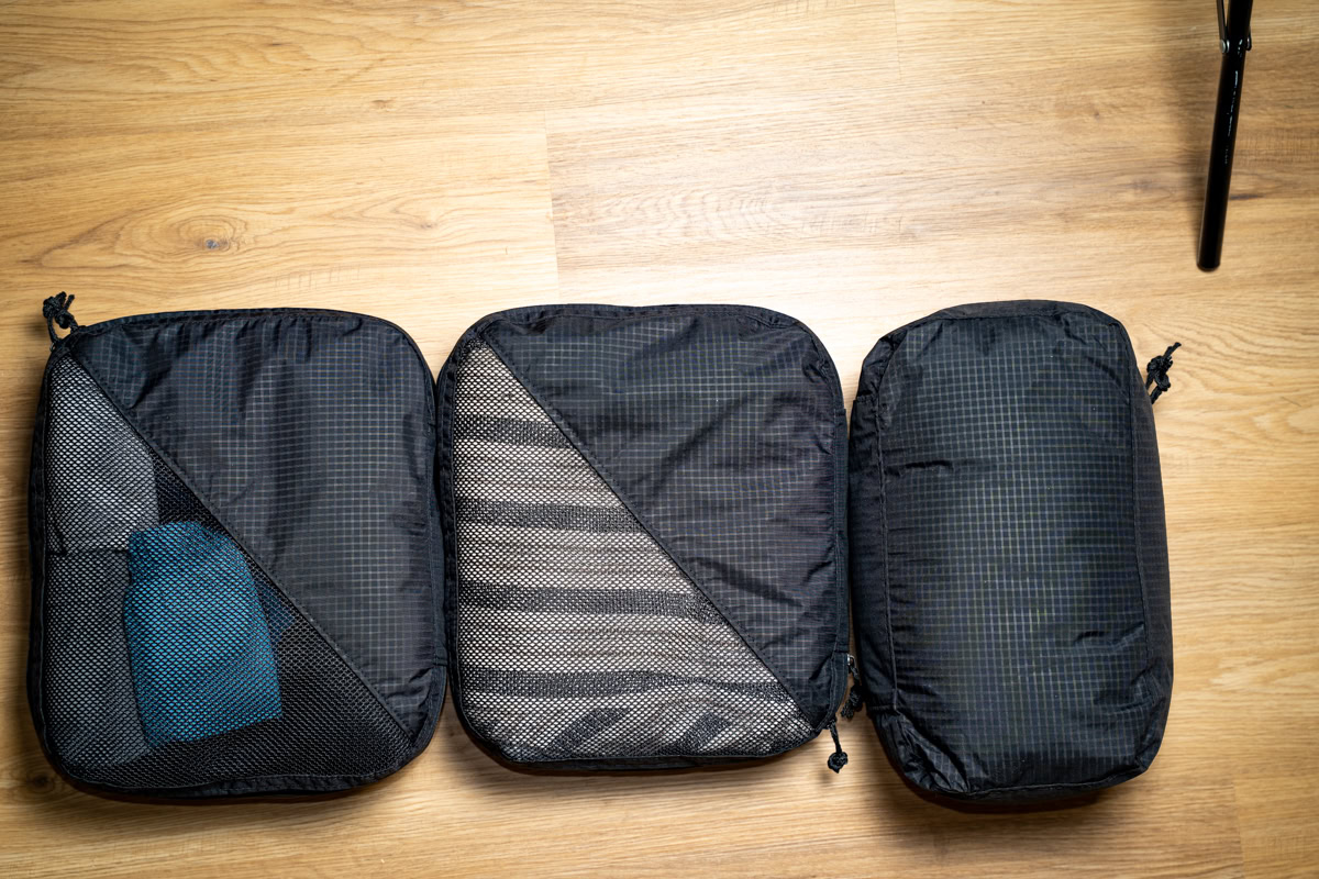 The sequence below showcases the 30L bundle in photo 1, how it fits inside of a 30L Dragonfly in photo 2, and how it fits in a 36L Dragonfly in photo 3. Please note that when packing the cubes, for the most efficient fit, stack the large cubes on top of one another when packing.